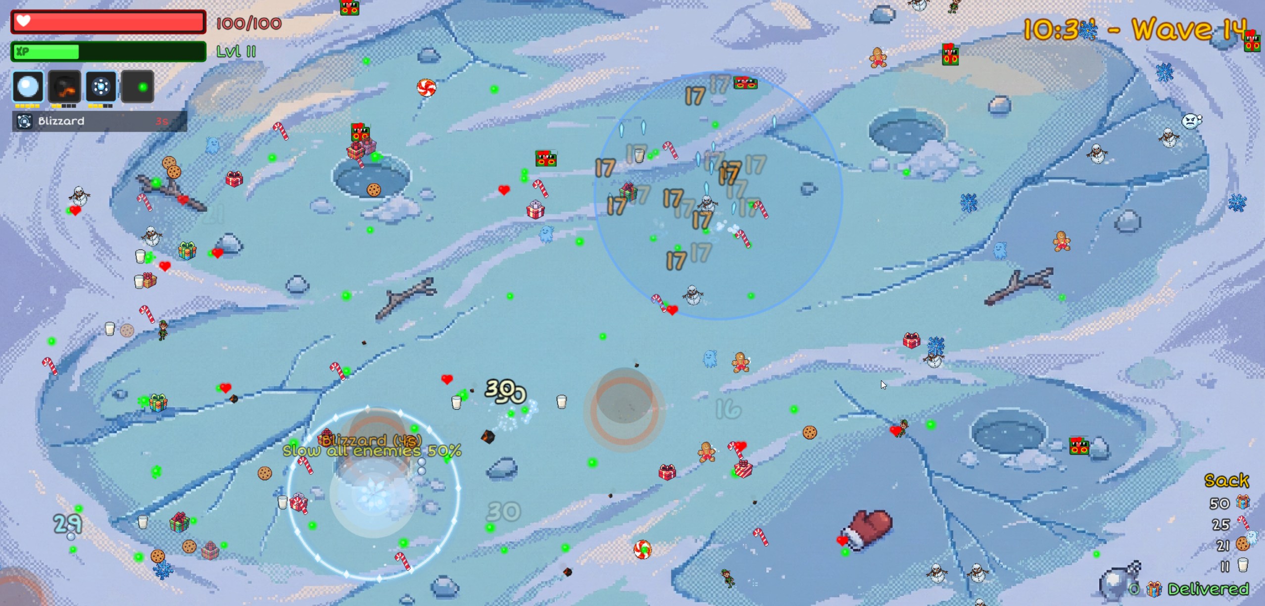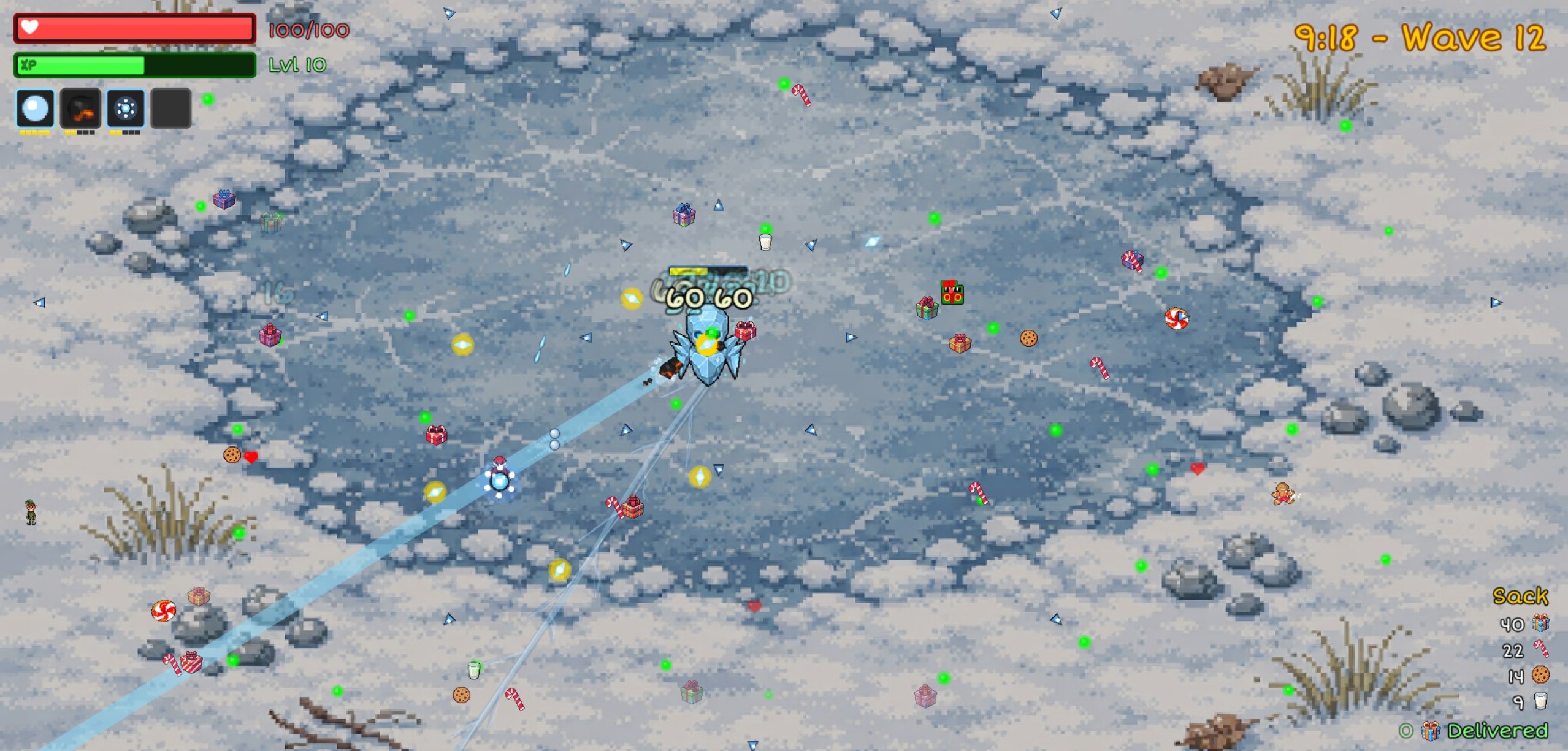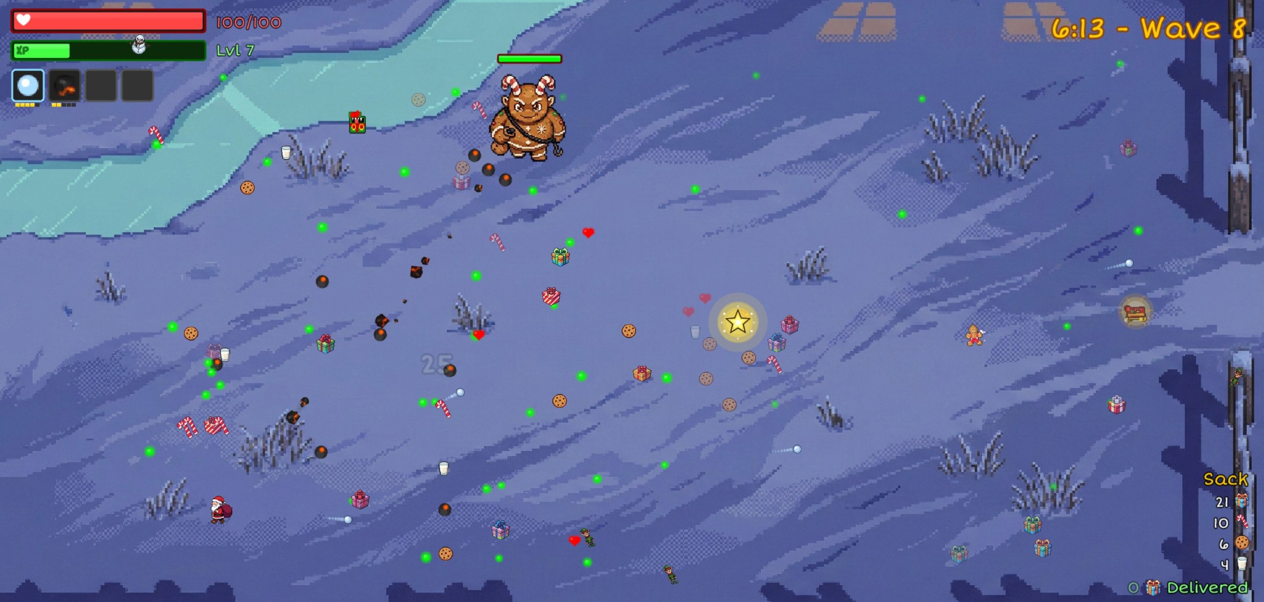 Every 4 waves, a boss storms in — Snowman King → Krampus → Jack Frost → Nutcracker General → Giftstealer → Yeti — each with their own patterns (and yes, one of them literally steals your presents). Defeat them for big rewards and see how far you can push the run!